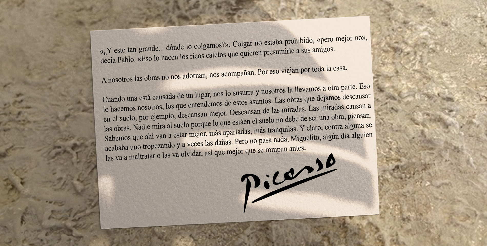 “Los cuadros nos enseñan a ver y a maravillarnos con el mundo. Después de observar un cuadro, el mundo se ha transformado o mejor dicho, nuestra visión del mundo. Solo a través del arte podemos salir de nosotros mismos, ver lo que otro ve de ese universo que no es el mismo que el nuestro”.